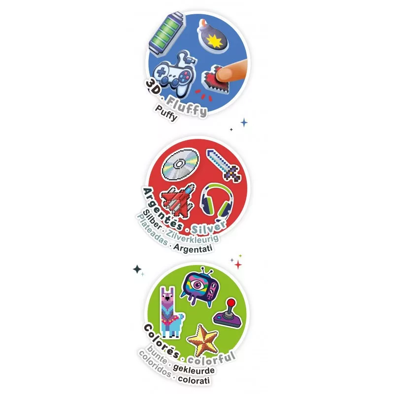 200 db-os matrica készlet a Buki márkától. A csomag öt A5-ös lapot tartalmaz: három színes matricákat tartalmazó lapot, egy ezüst kontúrokkal ellátott matricákat tartalmazó lapot és egy puha és vastag matricákkal ellátott lapot.