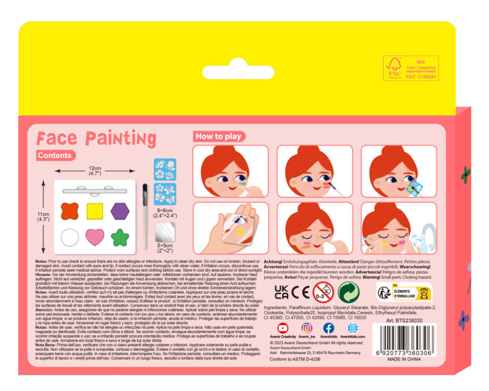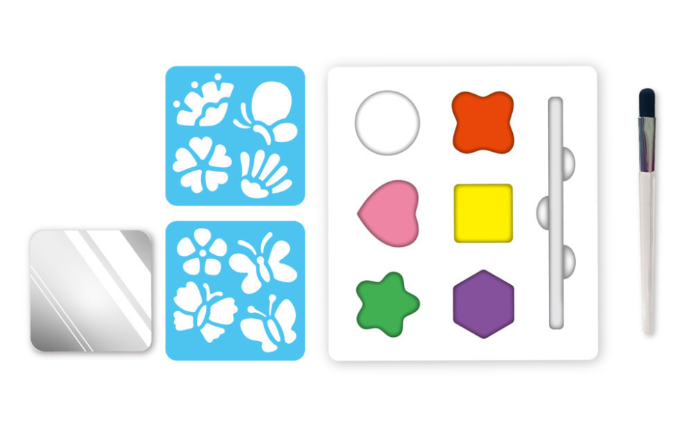Az Avenir új arcfestő készletei 6 gyönyörű arcfesték színt, valamint 2 újrafelhasználható stencil sablont, egy ecsetet és egy tükörmatricát tartalmaznak.