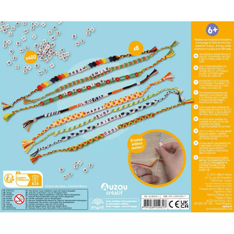 Egy gyönyörű szett, amely 8 különböző színű fonalat tartalmaz, hogy rengeteg brazil stílusú barátság karkötőt készíthess 400 betűgyönggyel kiegészítve. A fonalátvezető segítségével a betűgyöngyök könnyen átfűzheted a cérnákat, így megkönnyítve az alkotást. Nézd meg a videós útmutatót is a dobozon megtalálható QR-kód segítségével!