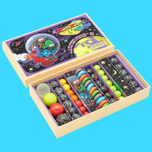 - 30 db 16 mm-es üveggolyó a Space Zinzins ikonikus színeiben és mintáival