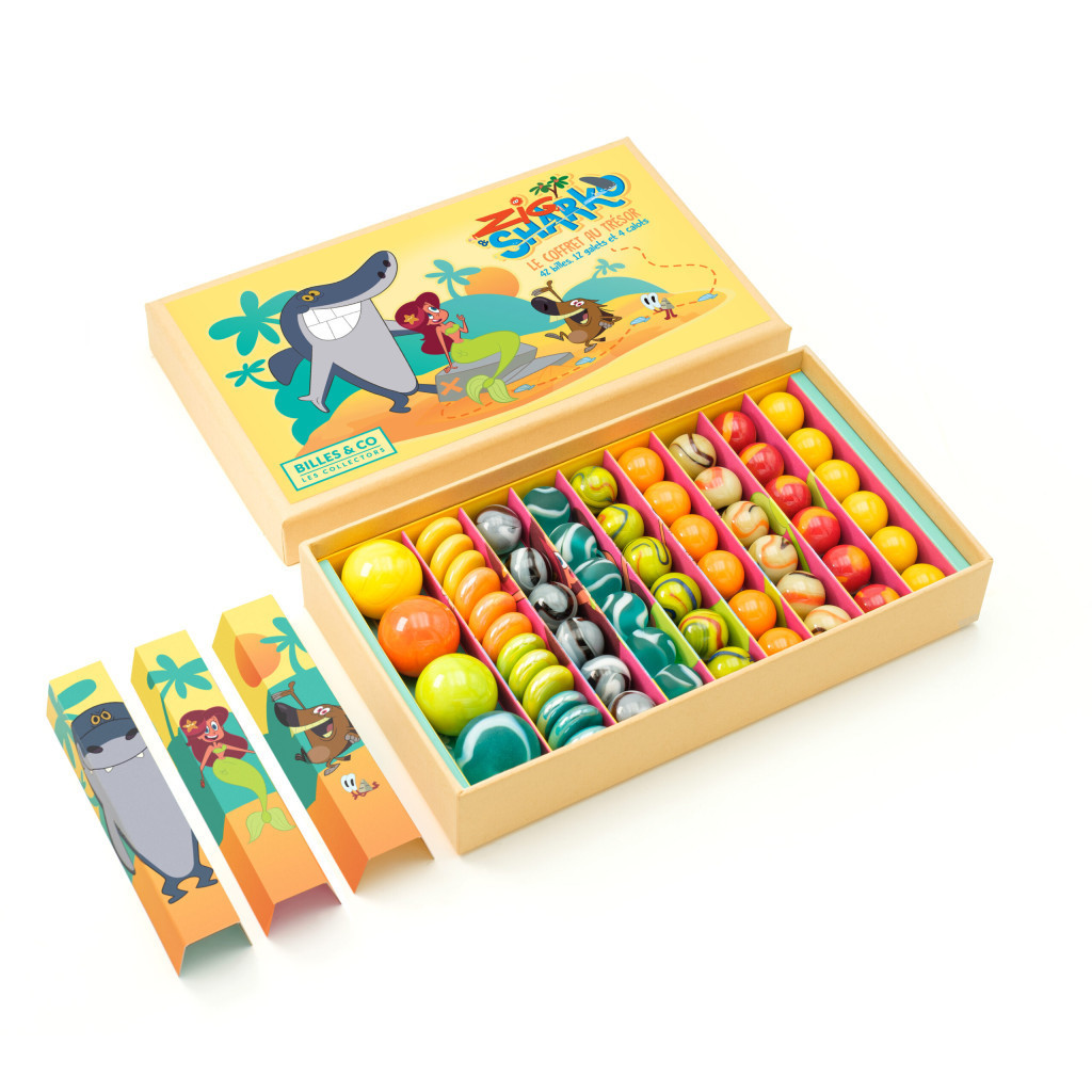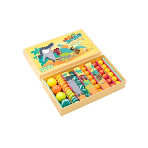 A Zig & Sharko szett 58 egyedi üveggolyót, kavicsot és lövedéket tartalmaz, amely tökéletesen idézi a sorozat tengerparti világát és élénk színvilágát: