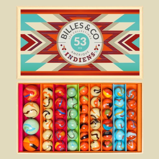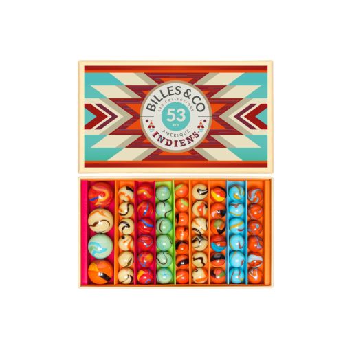 A American Natives szett 53 darab üveggolyót és lövedéket tartalmaz, melyek mindegyike gondosan válogatott a témához illő szín- és mintavariációkban: