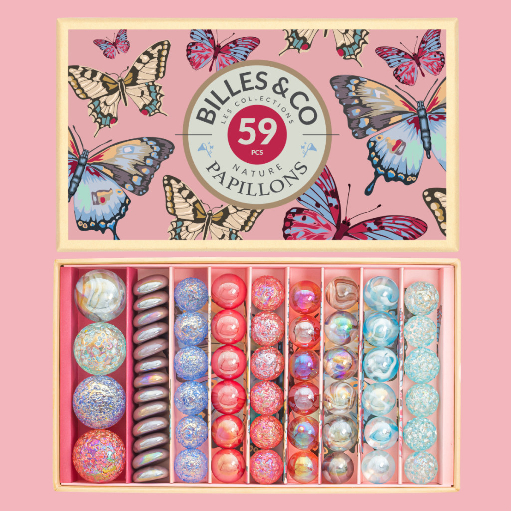 A Butterfly Anamorphic szett 59 üveggolyót, kavicsot és lövedéket tartalmaz, amelyek változatos színekben és textúrákban pompáznak, hogy minden játékot lenyűgöző élménnyé varázsoljanak:
