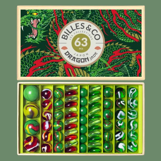 A Billes & Co Jade Dragon üveggolyó szett a jade erejét és a sárkány szellemiségét egyesíti, hogy megvédje a gyerekeket és gyűjtőket a képzeletbeli csaták során. Ez a szett 63 darab üveggolyót, kavicsot és lövedéket tartalmaz, melyek a zöld jade színeiben pompáznak, és a sárkányok világának különleges misztikumát idézik meg. Az indestructible jade védelmet nyújt a legfélelmetesebb ellenfelek, például a Tűzsárkány és a Yuzu Sárkány ellen – de vajon ki lesz a győztes?