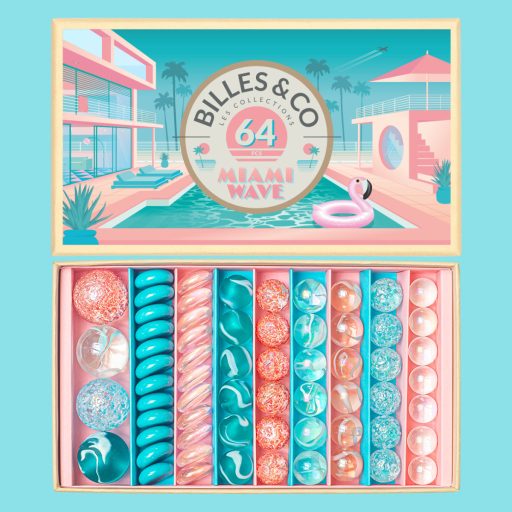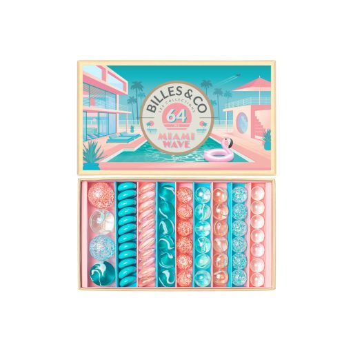 A Miami Wave szett 64 különböző üveggolyót, kavicsot és lövedéket tartalmaz, amelyek mindegyike Miami napfényes és trópusi színvilágát idézi meg: