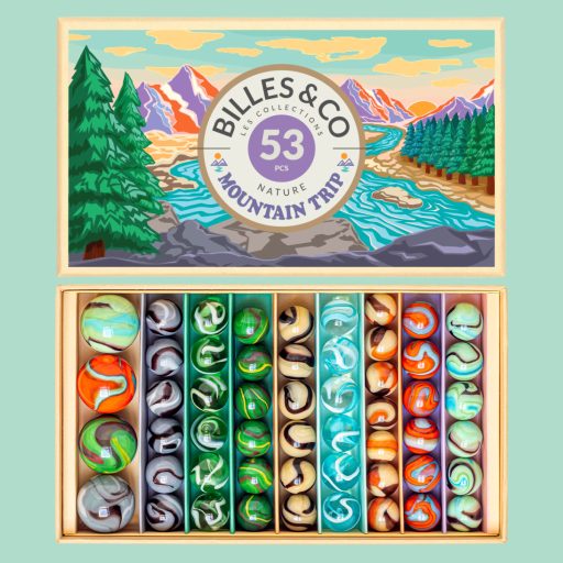 A Mountain Trip szett 53 üveggolyót és lövedéket tartalmaz, amely minden játékot egy igazi felfedező kalanddá varázsol: