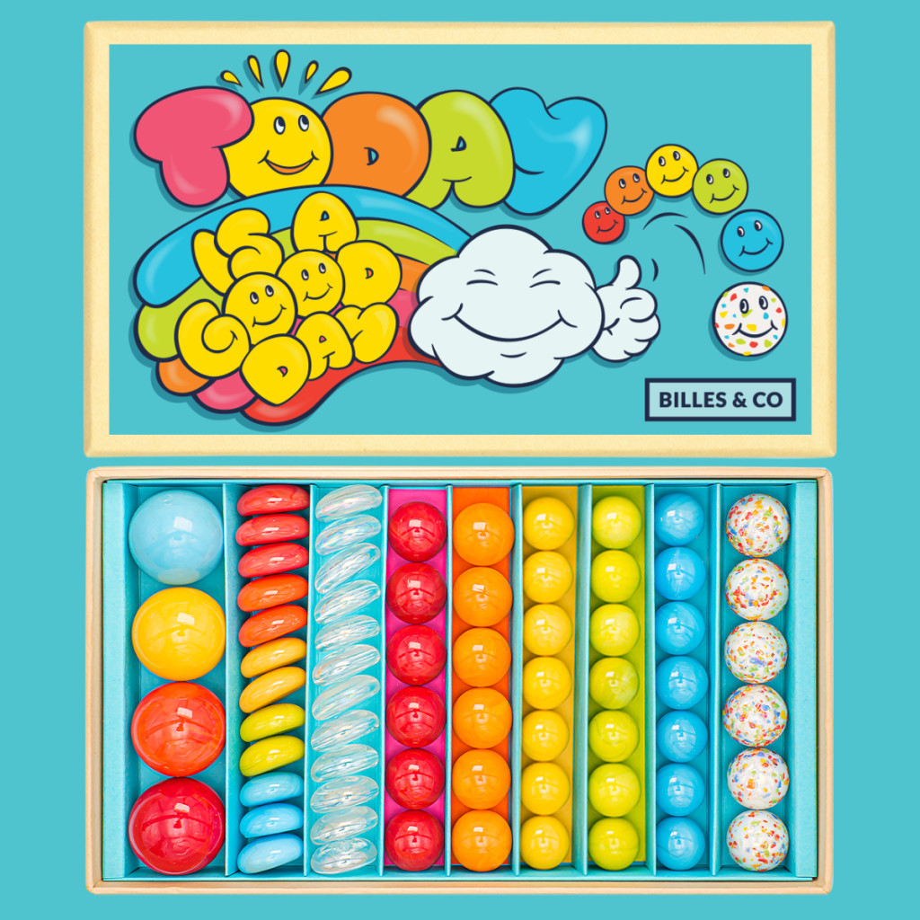 A Today Is A Good Day szett 67 darab üveggolyót, kavicsot és lövedéket tartalmaz, amelyek változatos szín- és formavilága örömöt és inspirációt nyújt minden korosztálynak: