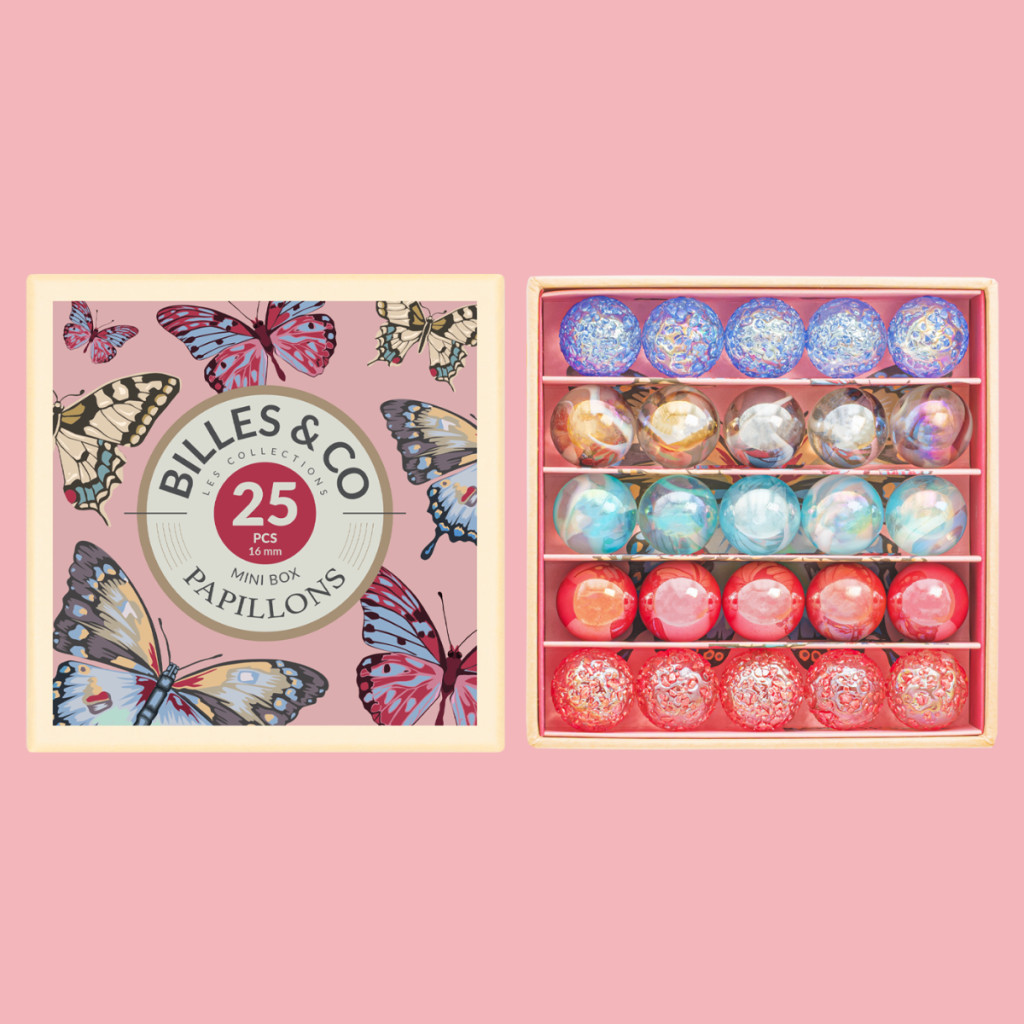 Az Anamorphic Butterfly szett 25 db 16 mm-es üveggolyót tartalmaz, öt különféle szín- és mintavariációval. A színek és textúrák sokfélesége lenyűgözi a gyerekeket, akik minden alkalommal új felfedezéseket tehetnek játék közben. A golyók Franciaországban, kézzel rendezve kerülnek a dobozba, biztosítva a prémium minőséget és az esztétikai élményt, amely minden játékidőt különlegessé varázsol.