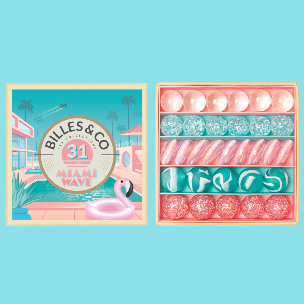 A Miami Wave szett 31 üveggolyót tartalmaz, négy színvariációval és egy különleges golyótípussal, így változatos játékélményt nyújt. A szettben található golyók különböző méretekben – 10 db 16 mm-es, 12 db 14 mm-es golyó és 9 kavics méretű darab – gondoskodnak arról, hogy minden játék egy újabb izgalmas élmény legyen. A golyókat Franciaországban, kézzel rendezik, így garantált a prémium minőség és az esztétikus megjelenés.
