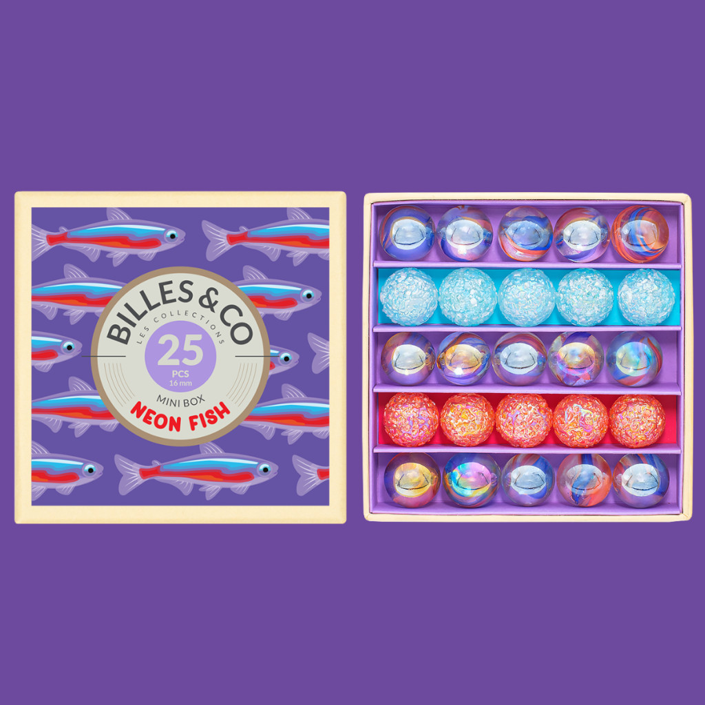 A Neon Fish szett 25 darab 16 mm-es üveggolyót tartalmaz, három különböző szín- és típusváltozatban. A golyók élénk színei és akváriumokat idéző megjelenése segíti a gyerekeket abban, hogy felfedezzék a természet különleges szépségeit. Minden darab Franciaországban, kézzel rendezve kerül a dobozba, hogy garantálja a prémium minőséget és esztétikai élményt.