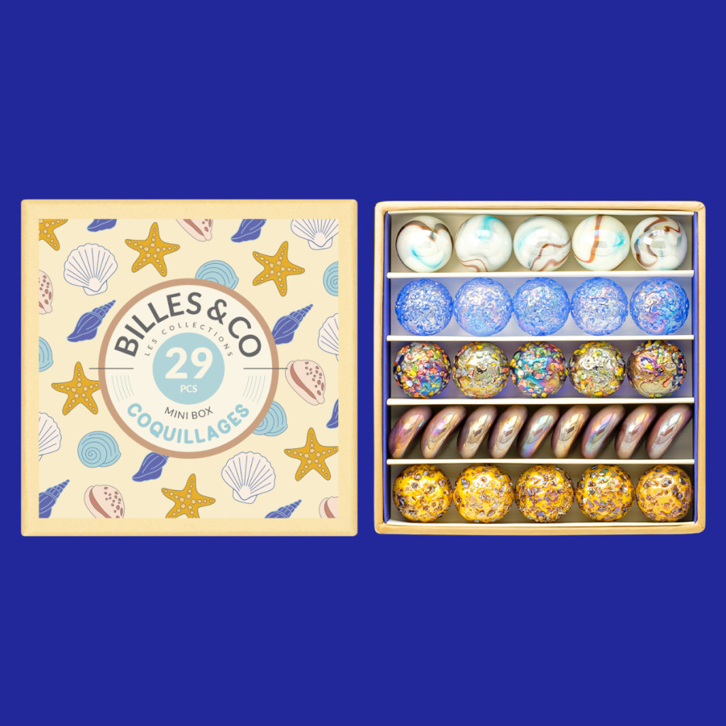 A Seashells szett 29 üveggolyót és kavicsot tartalmaz, négy különféle üveggolyótípussal és egy kavicsfajtával. Az összeállításban található: