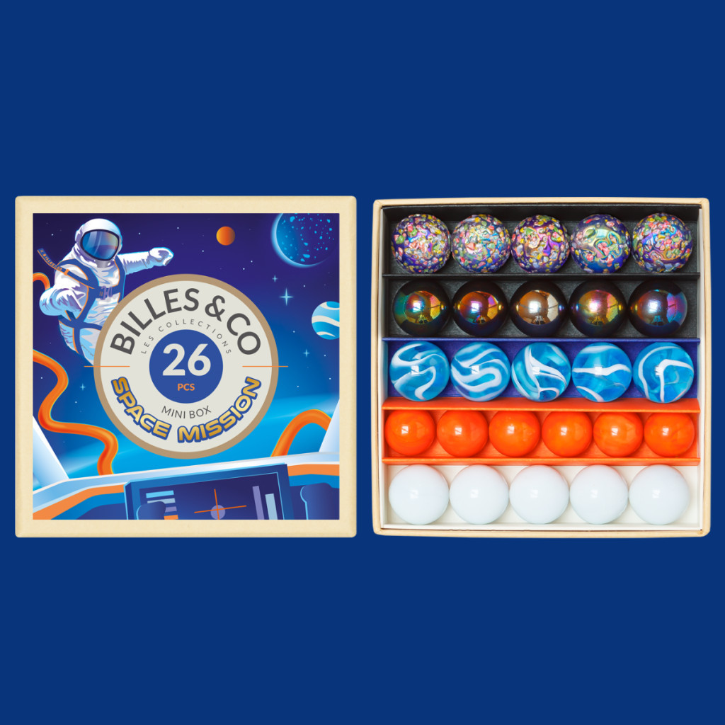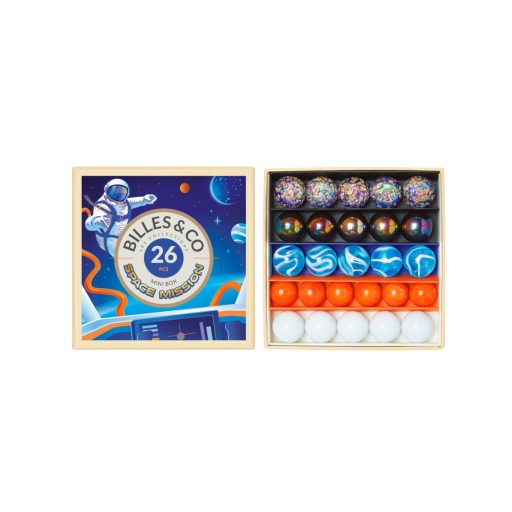 Ez a szett 26 különleges üveggolyót tartalmaz, öt változatos szín- és méretkombinációban, hogy minden egyes darab egy újabb űrkalandra hívjon. A szett 20 db 16 mm-es és 6 db 14 mm-es üveggolyóból áll, melyeket gondosan válogatnak és Franciaországban, kézzel rendeznek el a dobozban. A golyók különböző méretei és csillogó színei nemcsak a játékidőt teszik izgalmassá, hanem a gyermekek képzelőerejét és finommotoros készségeit is fejlesztik.
