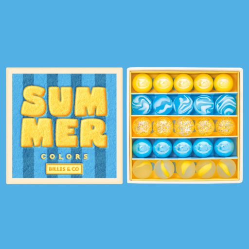 25 darab kézzel válogatott kincs: A doboz 5 különböző típusú, gondosan összeválogatott üveggolyót tartalmaz a legszebb nyári árnyalatokban.