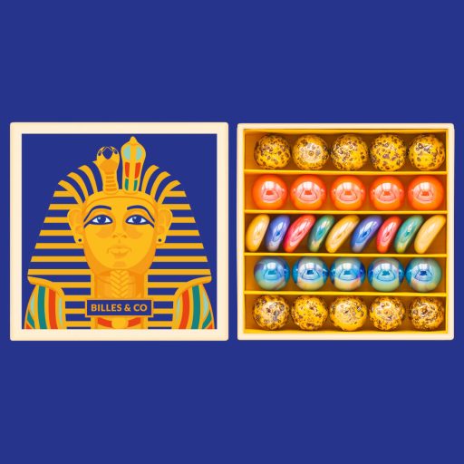 Amikor kinyitod a Tutanhamon maszkjával díszített, sötétkék éjszakát idéző dobozt, szinte megérint a sírkamrák csendje és misztikuma. Az aranyszínűen pöttyözött golyók úgy ragyognak, mint a napsütötte sivatagi homok, a mélyvörösek a lenyugvó nap erejét, míg az irizáló kék golyók és kavicsok a Nílus vizének és a fáraók ékszereinek titokzatosságát idézik. Az üveg hűvös, selymes felülete és a különböző formák tapintása meditatív élményt nyújt, ami segít a gyermeknek elmélyedni a játékban és megnyugodni egy pörgős nap után.