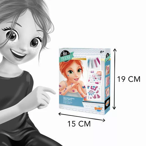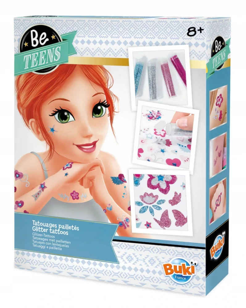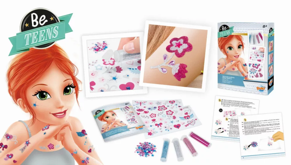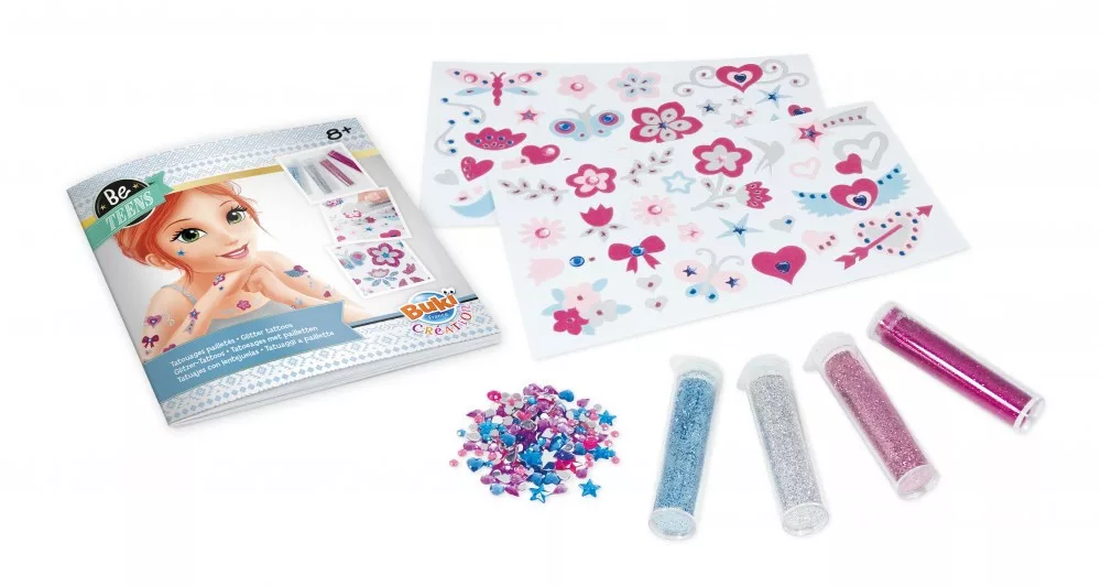 Tartalma: 4 tubus csillámpor, válogatott strasszok, 2 db kétoldalas tetováló lap, 1 színes illusztrált használati utasítás.
