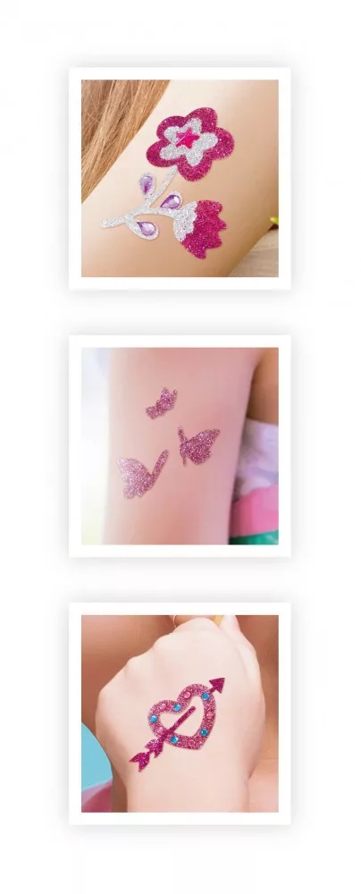 Válaszd ki a designt és készítsd el a divatos tetoválást a matricák és a csillámporok használatával!