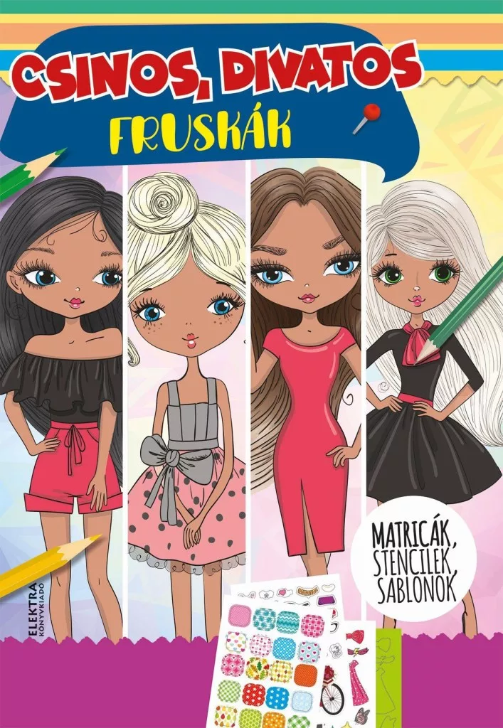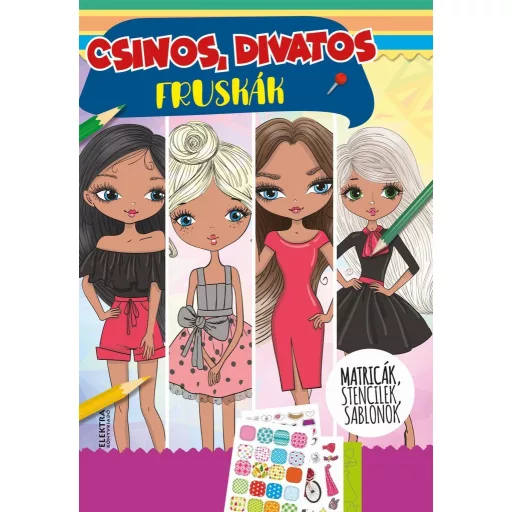 36 oldalas foglalkoztató kislányok számára, mely 1-1 oldal stencilt, öltöztető mintákat, matricát és fóliás matricát is tartalmaz.