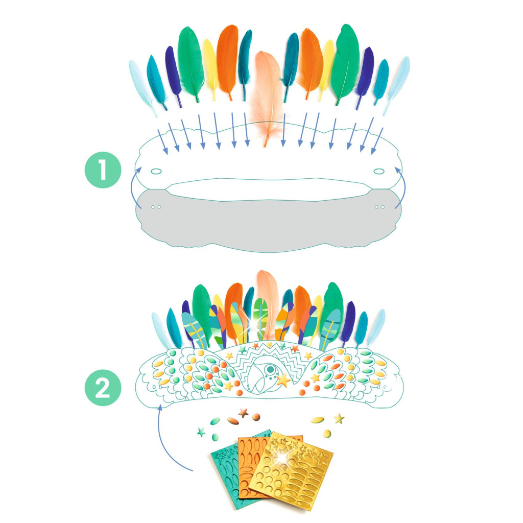 Egy karnevált idéző kreatív fejdíszkészítő szett 5 éves kortól. A szétnyitható textil fejpánt segítségével könnyen elkészíthető a tollakkal, matricákkal ékesített fejdísz. A különböző méretű színes tollakat ráhelyezzük a pánt öntapadós részére, összecsukjuk és a tollas díszt kívülről ellátjuk metáll hatású matricákkal. Aki nem vigyáz, azt máris magával ragadja a karneváli hangulat!