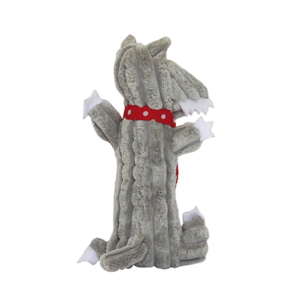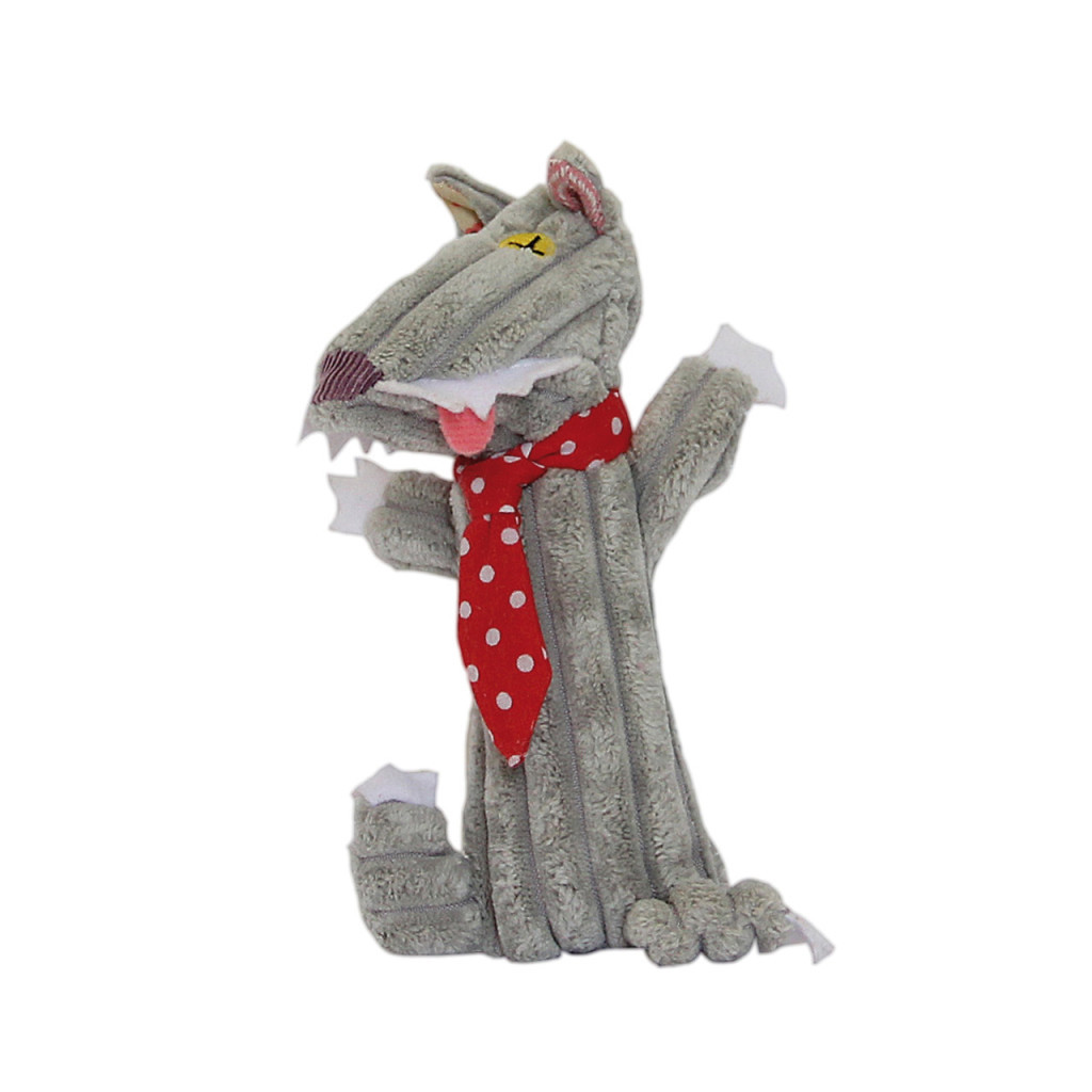 Gyermekkézbe tervezett, dédelgetni, nyomogatni, simogatni való, farkast formáló plüssjáték.