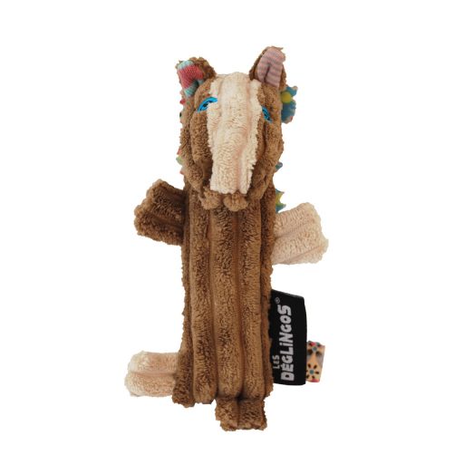 Gyermekkézbe tervezett, dédelgetni, nyomogatni, simogatni való, lovat formáló plüssjáték.
