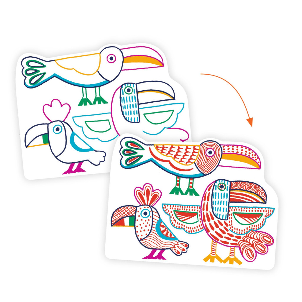 12 képet tartalmazó csomag, melynek állatait nagyméretű színes ceruzával lehet kiszínezni, kisgyermekek számára tökéletes. A gyerekek a ceruza segítségével színezik ki az ismerős állatokat, hogy felfedezzék, mi van elrejtve a képen. Varázslatos: a ceruza csak bizonyos területeket jelöl be, és a minták megjelennek, hogy felfedjék a meglepetéseket! A ceruza elég vastag, hogy a kicsi kezecskék biztonsággal foghassák. A varázslatos ceruza csak a tervezett területeket színezi meg, és láthatatlan elemeket tár fel, igazi meglepetés vonalról-vonalra, képről-képre! Ha ki is szalad a színezés a körvonalból, nem hagy nyomot. A gyermek a varázsceruzával színez, és előtűnnek az addig rejtett állatcsalád képek!