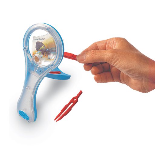 A kétfelé nyitható fogantyúval felállítható nagyító mögött, szabadon használható mindkét kéz. A fogantyúból kivehető csipesz lehetővé teszi az apró tárgyak megfogását, lencse mögötti vizsgálását.