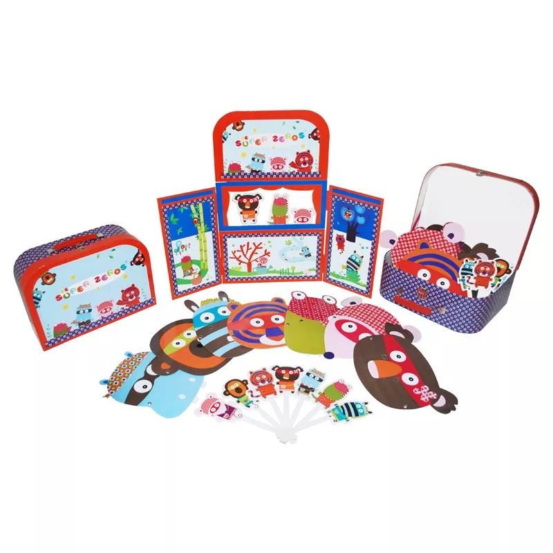 A Super Zeros maszk készlet 7 színes állatot ábrázoló álarcot tartalmaz és egy mini bábszínházat 7 állatfigurával.