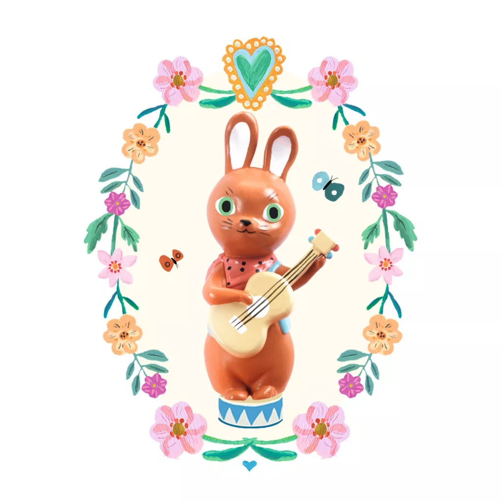 - Interaktív élmény: A hátul található kulcs felhúzása után, a fedél nyitásakor felcsendül Antoine Renard dala, miközben a gitározó nyuszi körbe-körbe forog.