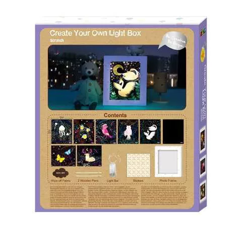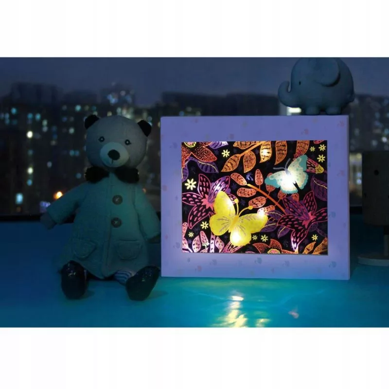 Te is szereted a fénylő égősorokat, a világító képeket és a hangulatvilágítást a szobádban? Akkor ezt a kreatív játékot neked találták ki, hiszen a csomagban található eszközök segítségével és a különleges karckép technikával egyedi és csodaszép dekorációt készíthetsz magadnak! A dobozban 8 darab karckép közül választhatod ki, melyiket szeretnéd kidekorálni és a mellékelt keretbe helyezni, hogy azután a LED fénysort is beillesztve megvilágíthasd. Különleges éjjeli fény, amelyet mindenki megcsodál majd és kellemes hangulatot teremt a szobádban!