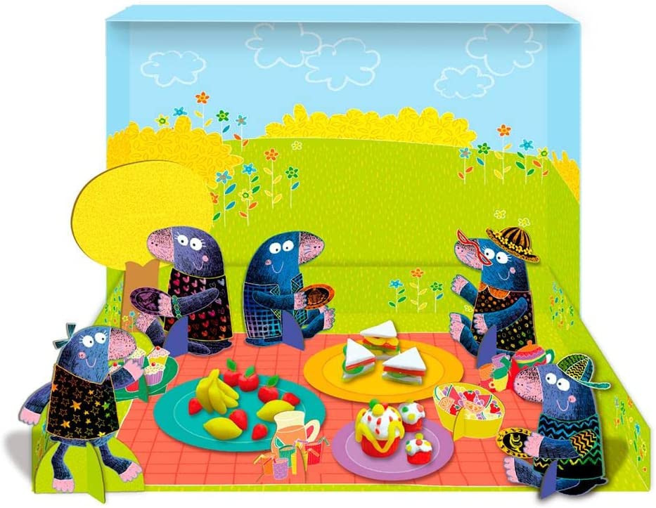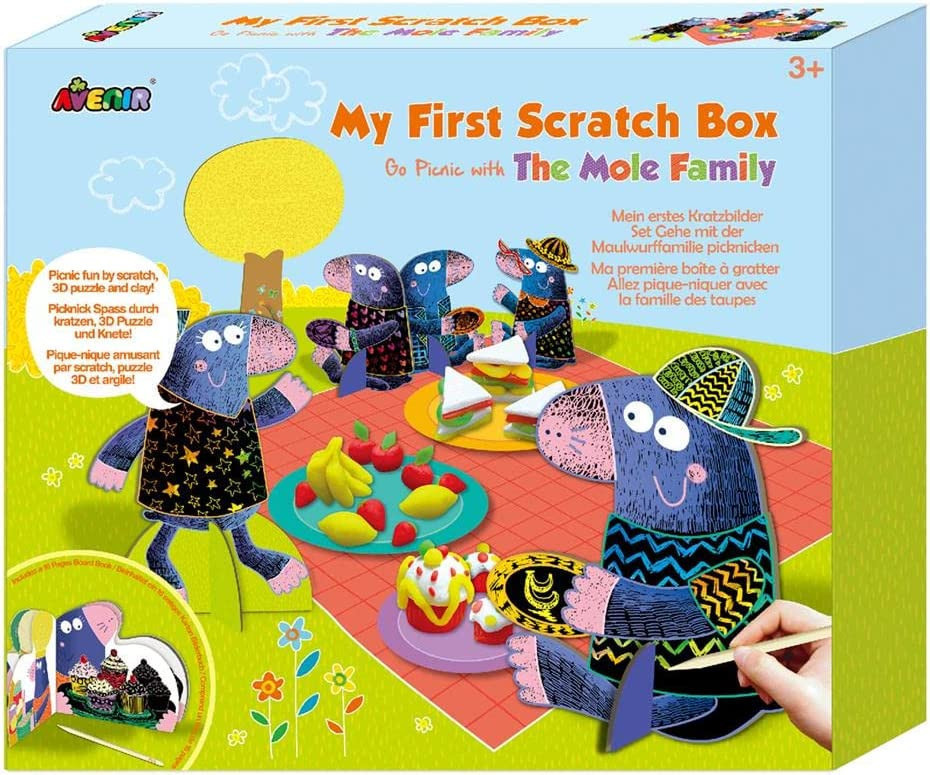 Az Első képkarcolós dobozom az Avenirtől egy nagyszerű készlet a gyerekek számára, mellyel kibontakoztathatják kreativitásukat és közelebb kerülhetnek a természethez. A dobozban található egy karckép könyv, különböző vakond figurák, melyeket szintén ki lehet színezni a képkarc technika segítségével és 3D modelleket lehet belőlük készíteni, és egy 4 színű gyurma készlet, amellyel egyedi ételeket hozhatnak létre a gyerekek a vakond család piknik ebédjéhez. A doboz belseje egyben a piknik helyszíne is, ahol a vakond család elfogyaszthatja a finom ételeket a szikrázó napsütésben.