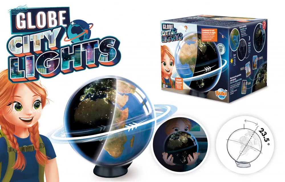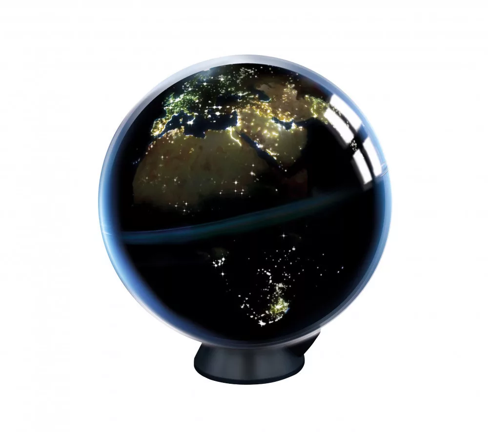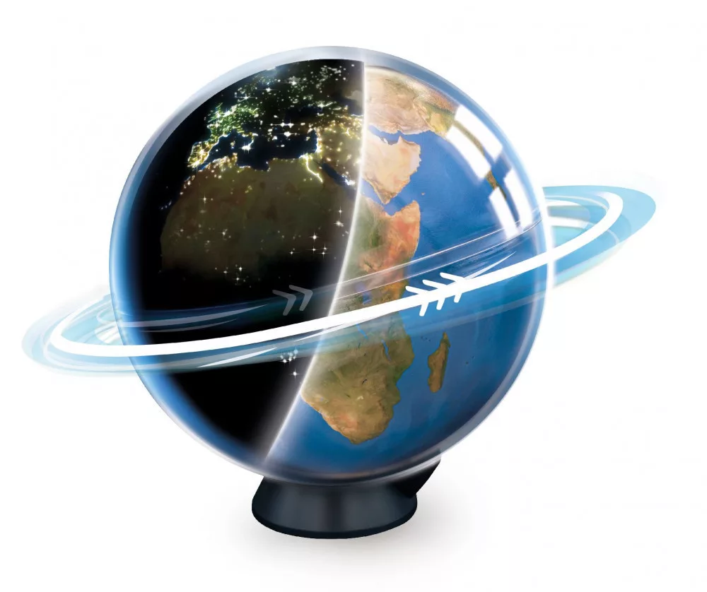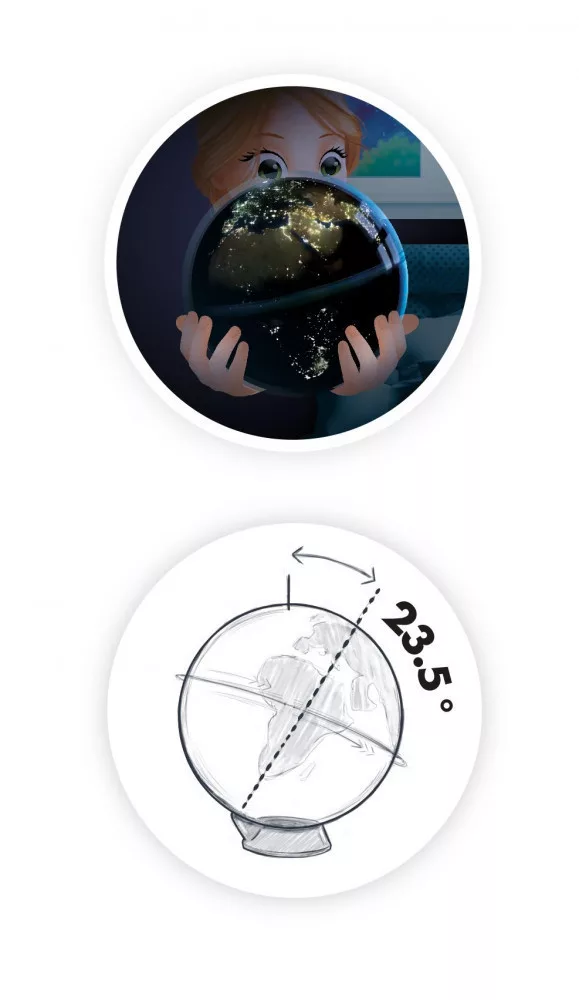 Vedd fel a földgömböt a kezedbe, láthatod, hogy ha bekapcsolod, akkor forogni kezd. Helyezd a talapzatára, hogy reprodukálja a Föld tényleges dőlésszögét.
