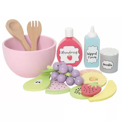 Keverd össze az összes gyümölcsöt az elre a célra szolgáló fa tálban és szervírozd a tejszínhabbal, eperkrémmel és dekor cukorkával. A salátás eszközök segítenek a tálalásban és a keverésben is.