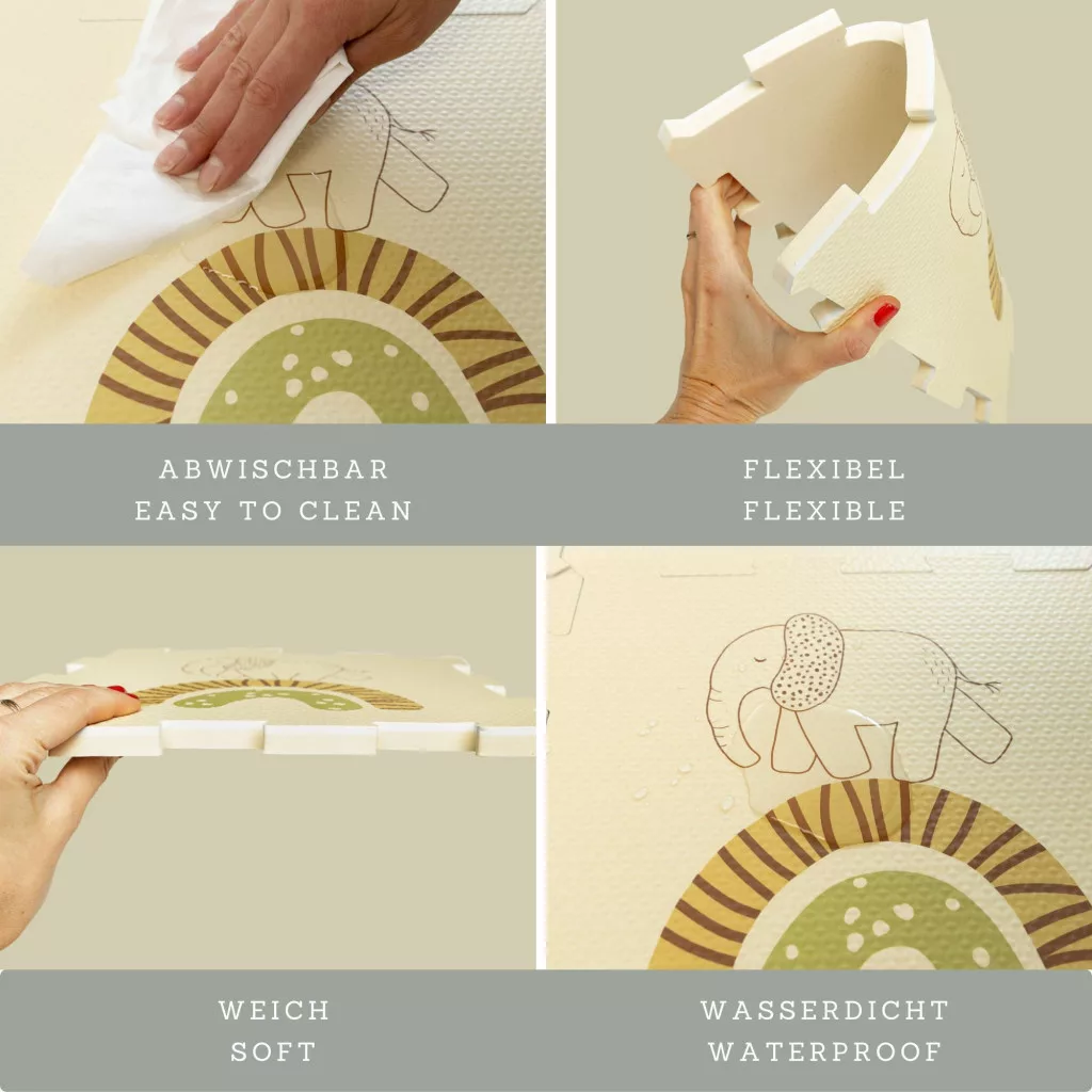 A szőnyeg különlegessége, hogy 1,2 cm vastag EVA habszivacsból készült, amely puhább és vastagabb a hagyományos 0,9-1 cm-es változatoknál, így fokozott védelmet biztosít a hideg padlón való játék közben. A szőnyeg minden szettje 9 darab 30x30 cm-es puzzle lapból és 12 élvédőből áll, amelyeket könnyedén összeilleszthetsz, így a szőnyeg mindig egybefüggő és esztétikus marad.