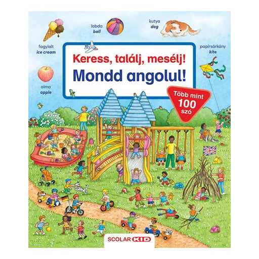 "Mi mindent látni a játszótéren, a pályaudvaron, az állatkertben és az építkezésen! Tudod, hogy mondják őket angolul? E böngészőkönyv képeit nézegetve játszva tanulják meg a szavakat a gyerekek. A Keress, találj, mesélj! sorozat készítői minden oldalpár szélén kiemeltek néhány tárgyat, élőlényt vagy személyt, melyeket a gyerekek megkereshetnek az adott oldalpár nagy méretű képén."
