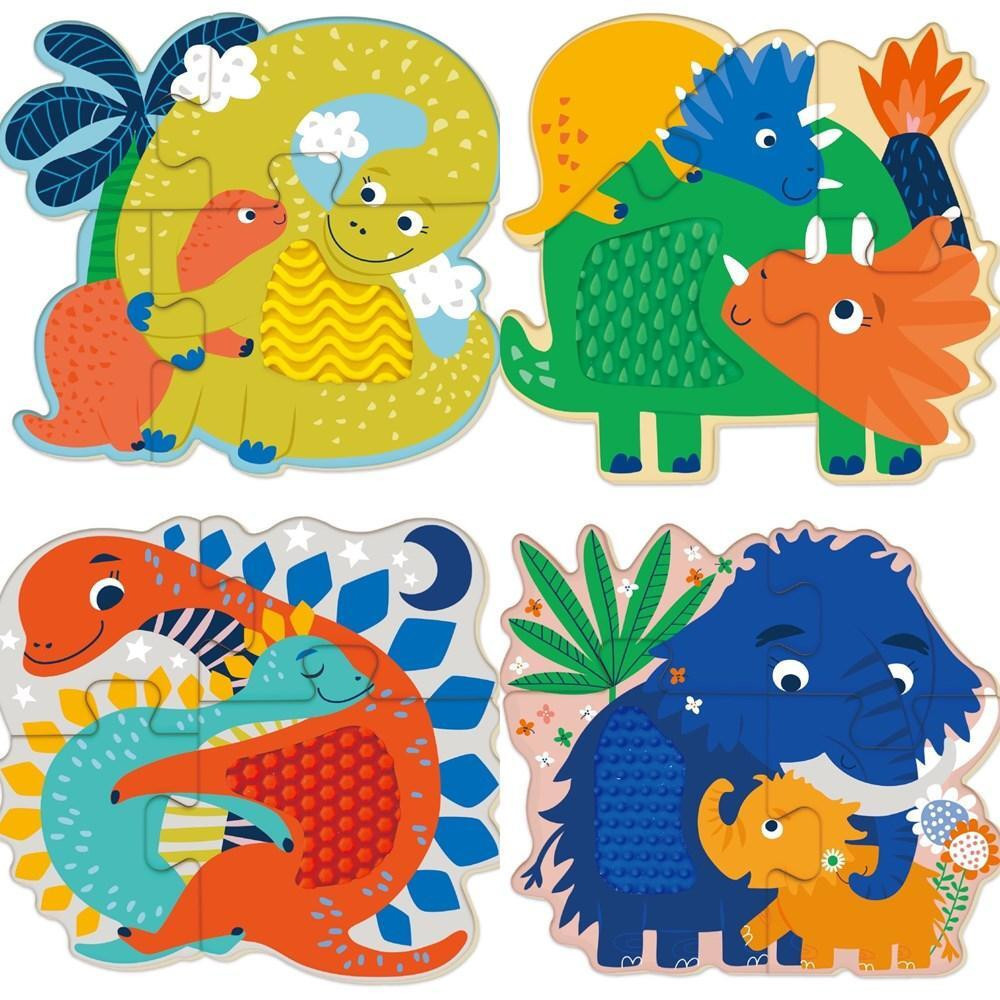 A dobozban 4 dinoszauruszos kép található, melyek mindegyike 4 darabból rakható össze. A könnyű, fából készült elemek texturált felületeket tartalmaznak, hogy a kicsik tapintását is fejlessze, miközben a kirakóval játszanak.