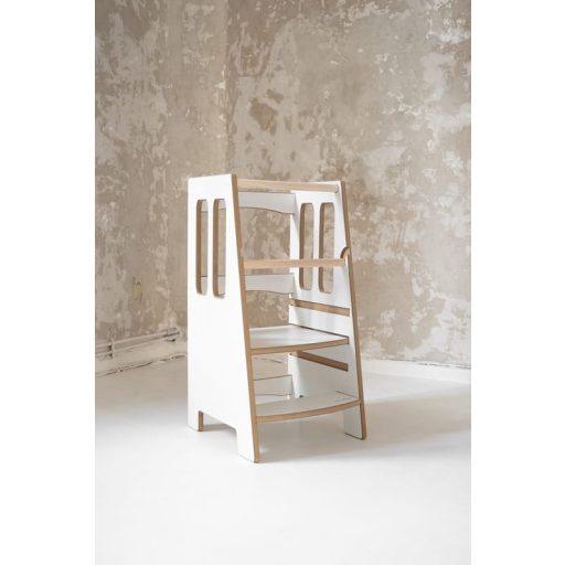 A háromszintű, szerszám nélküli magasságállítás lehetővé teszi, hogy a konyhai fellépő hosszú távon is használható legyen. A fellépő alján található lépcső segíti a biztonságos fel- és lemászást, így már kisebb korban is önállóan használható. Ez a modell a kompakt méret ellenére is meglepően stabil – súlyának és szerkezetének köszönhetően nem billen, nem inog.