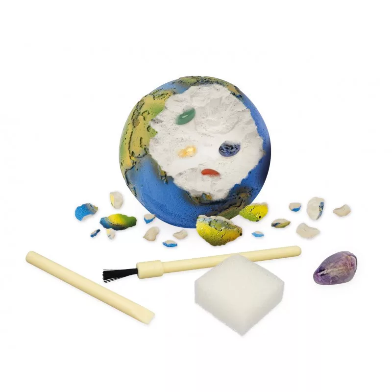 A kőzetek kedvelői most egy különleges, 8 cm-es átmérőjű Föld formájú gipszből áshatják ki az értékes 6 féle kőzetet, például egy ametisztet, egy szodalitot és egy opált.