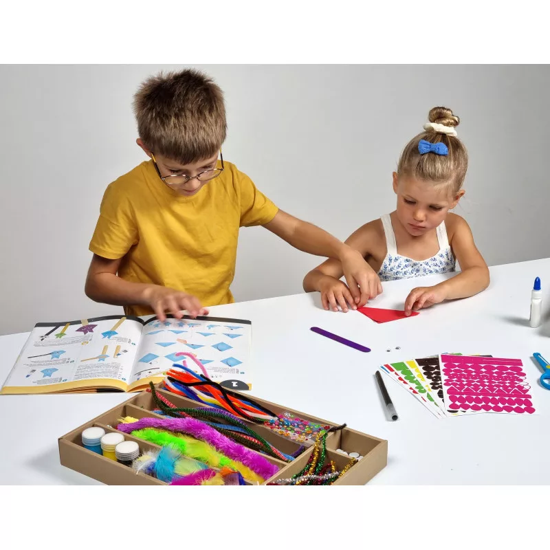 Tartalma: több, mint 800 kiegészítő és alapanyag található a csomagban, például hajlítható zsenília rudak, olló, ragasztó, pamutfonalak, fapálcikák, gyöngyök, festékek, matricák, felragasztható mozgó szemek, stb.