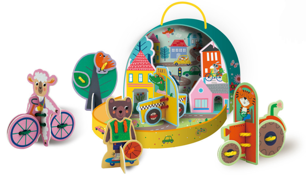 Építsd össze a 3D puzzle figurákat, majd használd a cipőfűző szerű fonalakat és fűzögesd össze a megfelelő részeket, így megelevenítheted kedvenc állatos jeleneteidet a városi forgatagban!