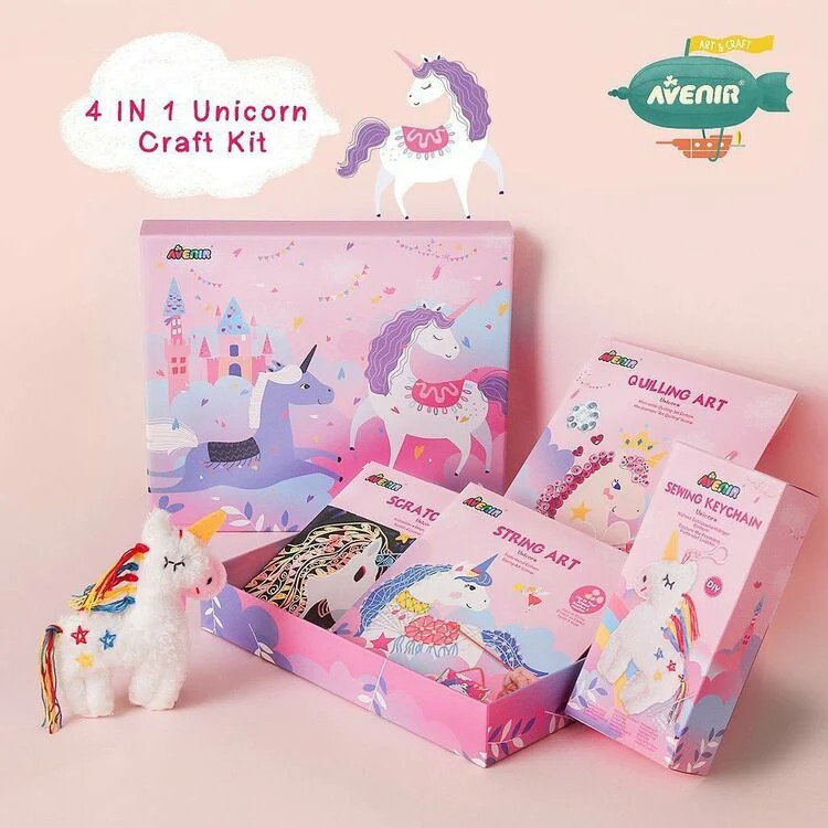 Unikornisos kreatív készlet, mellyel 4 különböző kreatív technikát próbálhatsz ki! A készlettel egy varrható kulcstartót, 4 gyönyörű karcképet, 3 quilling technikával kidíszített üdvözlő kártyát, és egy fonalképet készíthetsz el. A készlet összesen 260 tartozékot tartalmaz.
