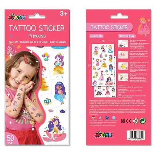 50 db-os lemosható tetoválás csomag az Avenir Kids márkától hercegnők témakörben. A tetoválásokat vízzel és szappannal könnyű eltávolítani.