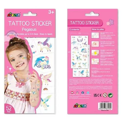 52 db-os lemosható tetoválás csomag az Avenir Kids márkától unikornis témakörben. A tetoválásokat vízzel és szappannal könnyű eltávolítani.