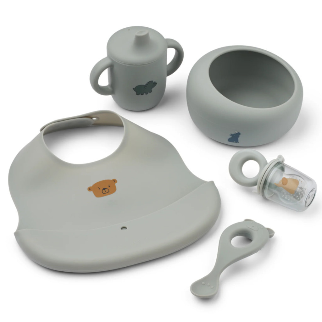 Komplett 5-részes prémium szett: Mindent tartalmaz, amire a kezdetektől szükségetek lesz: ergonomikus kanál, tál, pohár, etetőcumi és egy zsebes előke várja a felfedezést.