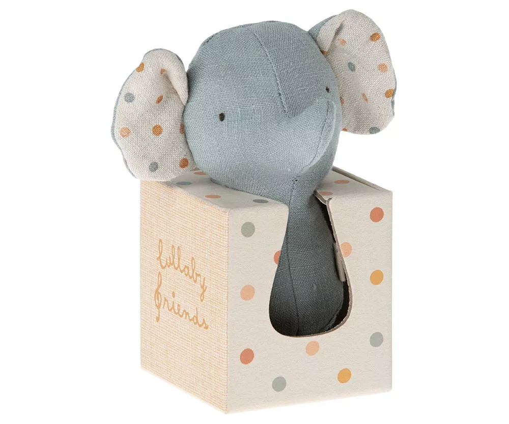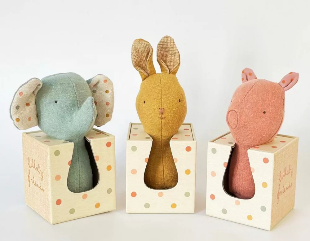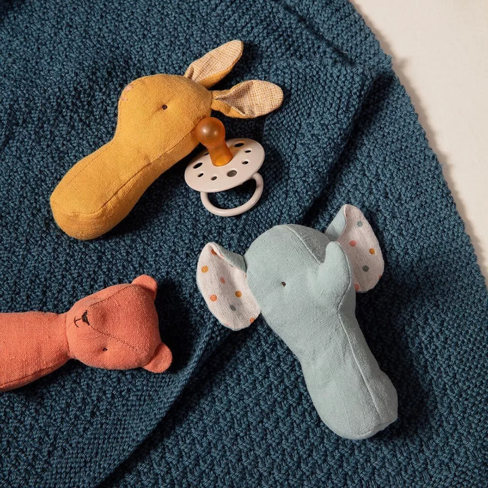 A Maileg baba csörgője újrahasznosított poliészterrel töltött pamut vászonból készült. Tökéletes ajándék minden babának.