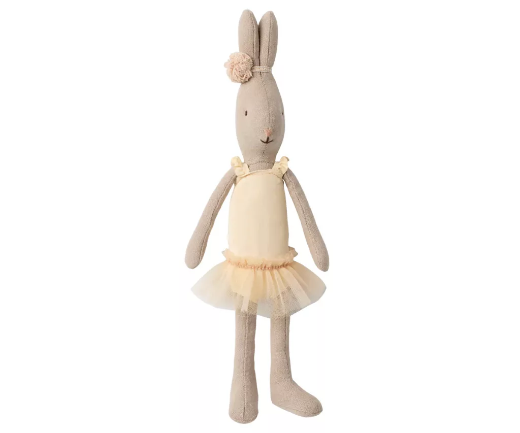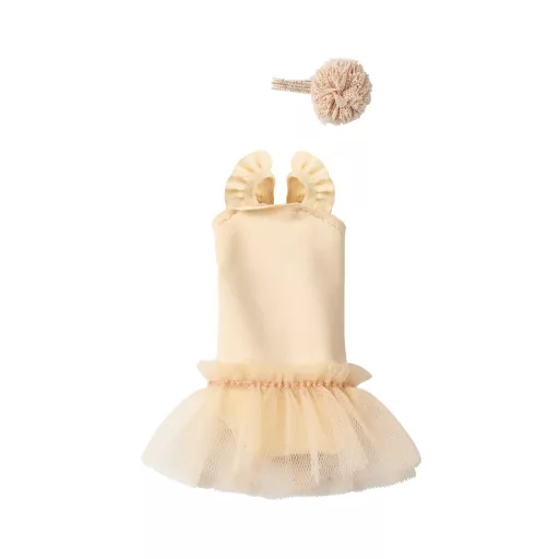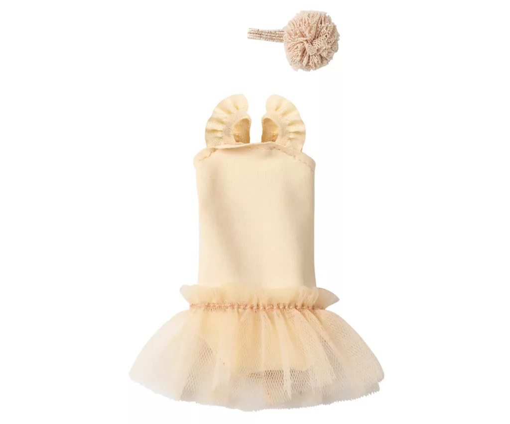 Tökéletes választás egy varázslatos balett óra vagy előadás kedvéért. Ez a finom krém színű szett egy kényelmes balettruhát, légies tüllszoknyát és egy bájos pomponos fejdíszt tartalmaz – mindent, ami a kedvenc mini méretű Maileg nyuszi vagy egér teljes átalakulásához kell.