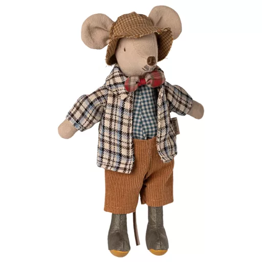 Amint a kezedbe veszed ezt a 16 cm-es apró csodát azonnal érezni fogod a pamut szövet finom textúráját és a nadrág karakteres kordbársony bordázatát. A nagypapa szemrevaló csokornyakkendője és stílusos kalapja minden részletében a dán precizitást tükrözi. Az egérke puhasága és barátságos bajusza azonnal bizalmat ébreszt a legkisebbekben is. Ez a figura tökéletesen illeszkedik a Maileg SuitCasa babaházunkba ahol ő lehet a ház ura aki mindenkit felvidít a meséivel.