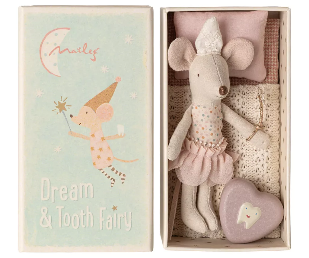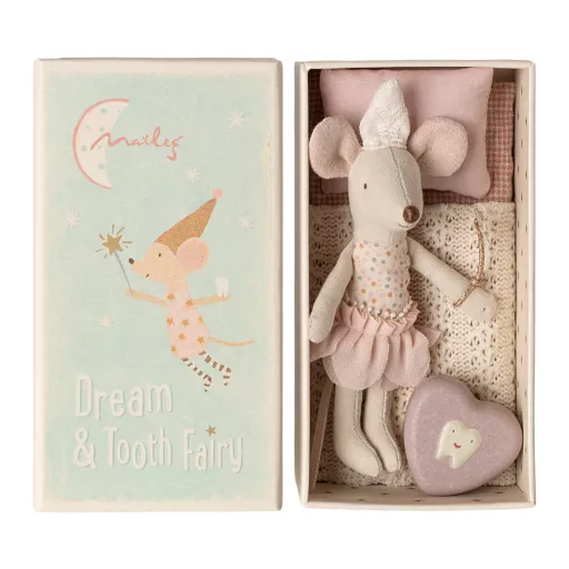 Amikor este elalszol, a Maileg Fogtündér egér – Kis nővér szárnyra kap, hogy elhozza a varázslatot. Puha, aprólékosan kidolgozott ruhát visel, kis koronával a fején és varázspálcával a kezében. Saját gyufásdoboz-ágyában pihen, mellette egy szív alakú fogtartó dobozka, ahová biztonságban elrejtheted a kiesett fogacskát.