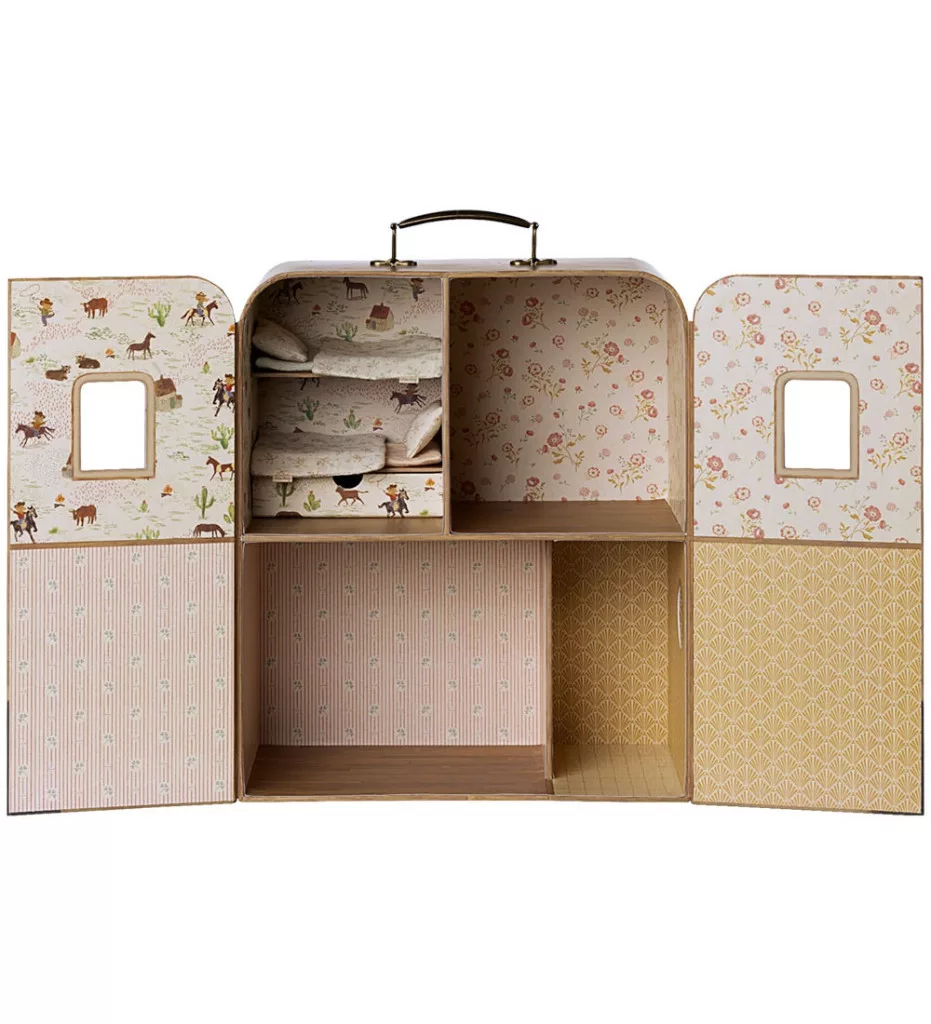 Amint kinyitod a SuitCasa két szárnyát egy lenyűgöző miniatűr világ tárul eléd. Az egyik oldalon vadnyugati cowboyok vágtatnak a másik oldalon pedig finom virágminták varázsolnak romantikus hangulatot. A falak érintése a prémium papír textúrájának köszönhetően kellemes és meleg. Tökéletesen passzol a Maileg kisméretű bútoraival és egérkéivel így fokozatosan bővítheted ezt a kis birodalmat. A pamut ágyneműk puhasága és aprólékos kidolgozása garantálja hogy a játék minden perce minőségi és örömteli legyen.