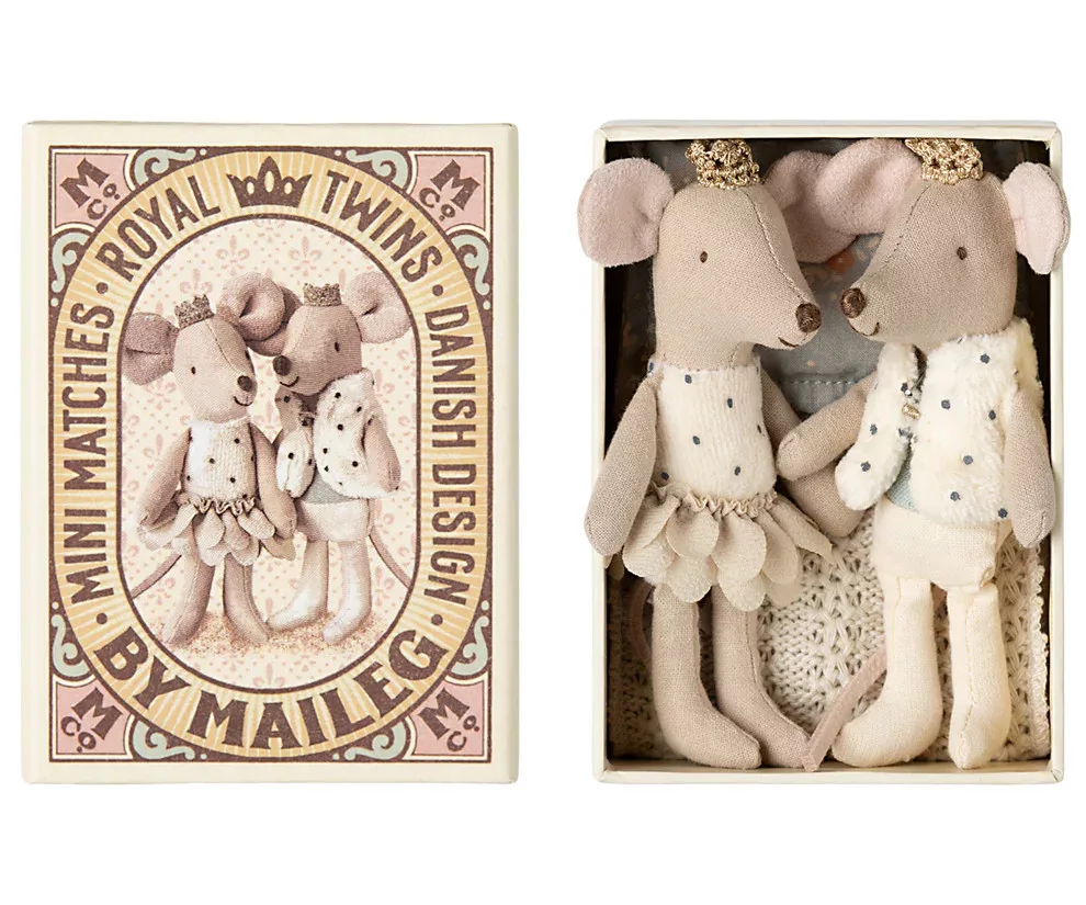 A Maileg királyi egértesók egy igazán különleges páros, akik gyufásdobozban laknak, és tökéletesen illenek a Maileg kastélyba. A királyi egérpár arany koronát visel, és gyönyörű ruhákba van öltöztetve, amelyek azonnal elvarázsolják a gyerekeket. Az aprócska gyufásdobozban kényelmesen alszanak, és készen állnak a játékra.