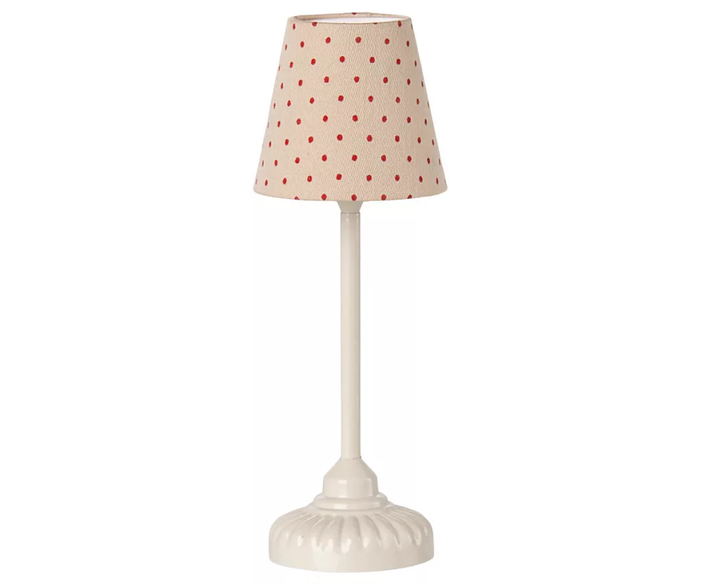 Egy aprócska lámpa, ami igazi hangulatot teremt – pont, mint egy igazi otthonban. A Maileg Vintage lámpa (Mouse – Sand) finom, szürkés-bézs árnyalatával és piros pöttyös textilernyőjével meghitt fényt ad a kis egérszobákban. Amikor eljön az este, csak kapcsold be, és a szoba megtelik puha, meleg fénnyel – mintha egy meséből lépett volna elő.